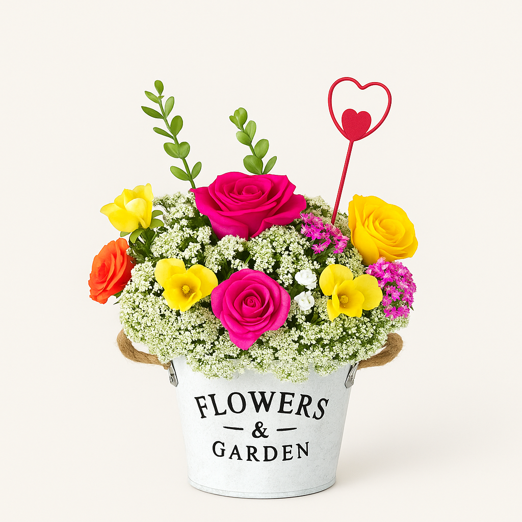 Popurrí Vintage es un arreglo que celebra la armonía de los contrastes y el encanto de lo atemporal. Combina rosas en tonos vibrantes con delicadas flores de relleno blancas y acentos verdes, logrando una composición equilibrada, fresca y visualmente cautivadora. Cada flor mantiene su protagonismo sin perder cohesión, como un portafolio bien diversificado: colorido, elegante y sólido.